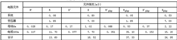 有一配电系统如图所示,配电变压器容量为1000kVA,10/0.4kV,uK2%=4.5,S9型,绕组结线为Dyn11,连接母线及电缆的参数均表示在图上,各元件的相电阻R、相电抗X、相保电阻Rphp及相保电抗Xphp值列于表。