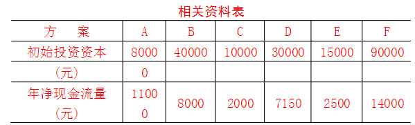 某个大型投资项目有6个可供选择的方案,假设每个方案均无残值,计算期为10年。各方案的数据见下表。
