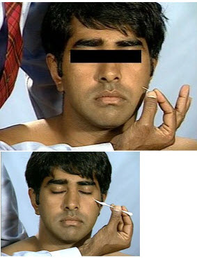 女,35岁,右侧乳突区痛2天,口角向左歪1天。最有助于定位诊断的体征是( )