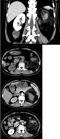 A:左肾区可见一巨大的占位性病灶,境界较清楚,胰腺尾部受压向前推移