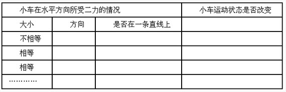 1.使两托盘里的砝码质量不相等: 2.使两托盘里的砝码质量相等: 3.保持两托盘里的砝码质量相等,把小车在水平桌面上扭转一个角度后释放: 请把实验条件和现象记录在下面的表格中。
