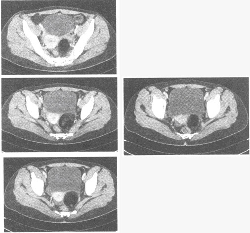 女,35岁,下腹部胀痛,CT扫描如图所示,盆腔内囊实性肿块影,其内CT值不均,CT值-120~360HU不等,最可能的诊断是()