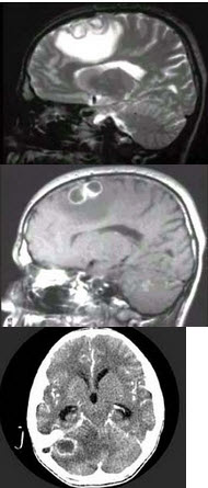 男,36岁,一周前出现全身发热、头痛、乏力,经过对症治疗病情好转,随后再次出现头痛,并伴有恶心、呕吐,急到医院检查,MRI检查如图所示,最可能的诊断为( )