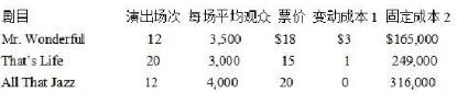 1.表示付给演出公司的金额,基于售票情况而定。. 2 直接与每场演出相关的服装、设施和演员的成本。 Starlight在整个季节中也将付出$565,000 的一般性固定营业费用(包括管理费用,设备成本,和广告费用),另外还要承担30%的所得税。 如果管理层希望Mr. Wonderful剧目对公司今年的总营业收入产生的税后收益为$210,000,那么该剧目需要的观众数量为()