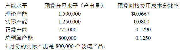 Nash玻璃制品公司每月有预算固定生产间接费用$100,000。公司的内部和外部财务报告目的都使用吸收成本法。4月份不同产出分母水平下的成本分摊的预算间接费用率如下显示