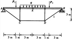 图示组合结构,P1=P2=5kN,均布力q=2kN/m。则杆1的内力应为()。