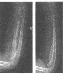 男,7岁,右前臂肿痛20天,发病时皮温较高,体温达39℃。实验室检查:WBC://12.05×10/L,中性粒细胞79%。右尺桡骨正侧位DR片如图