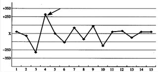 下列图形中箭头所指的"点"违背了West-gard基本质控规则中的()