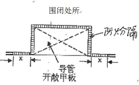某货船厨房排气导管与起居处所有三个面是共同边界,导管的一个面面向开敞甲板,为满足防火隔热要求,设计采用图示的隔热布置,请回答这样布置能否符合公约要求,如能符合,图中X应取多少?