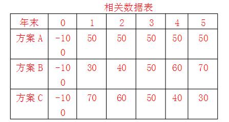 方案A,B,C计算期内各年的净现金流量如下表所示,基准收益率为10%,计算各方案的净现值、将来值和净年值。