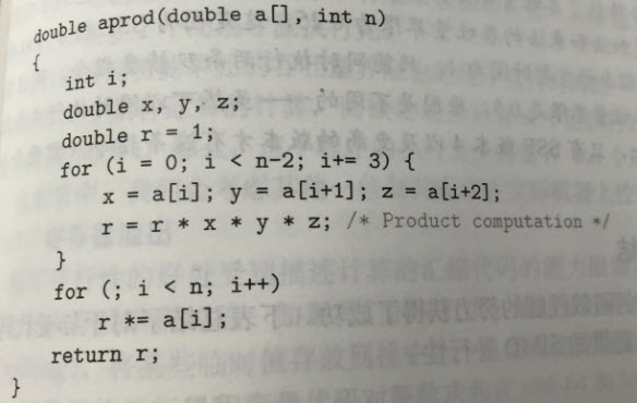 考虑下面这个函数,对于标记为Product computation的行,用括号创建该计算的一种组合为r=r*((x*y)*z).假设在一台双精度乘法延迟为5个时钟周期的机器上运行这些函数。根据惩罚的数据相关,下列哪个是该组合CPE的下界?()