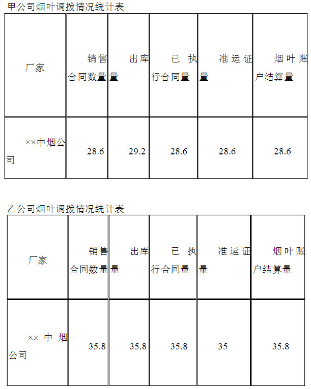 以下是某省内管检查组对辖区甲、乙两市烟草公司烟叶调拨情况检查后得出的表格: