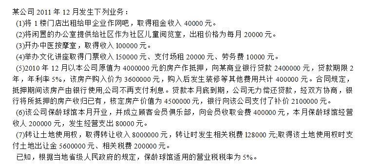 根据上述资料和税法的有关规定,回答下列问题。 (1)2011年12月该公司按“服务业——租赁业”税目缴纳营业税()元。 (2)2011年12月该公司转让房地产应缴纳营业税()元。 (3)2011年12月该公司应缴纳营业税共计()元。