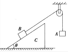 如图所示,倾角为θ的斜面体C置于水平面上,B置于斜面上,通过细绳跨过光滑的定滑轮与A相连接,连接B的一段细绳与斜面平行,A、B、C都处于静止状态,则()。