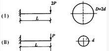 材料相同的悬臂梁Ⅰ及Ⅱ,所受荷载及截面尺寸如图所示,关于它们的最大挠度,结论正确者为()。