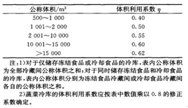 ,其中柱子面积占1.2%。冷藏间净高4.2m。按《冷库设计规范》(GB50072-2001).冷藏间体积利用系数不应小于下表的规定值。