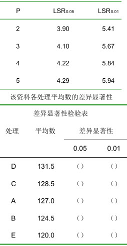 假设某一试验资料结果分析已经计算出了多重比较的最小极显著极差值—LSRα表,试用标记字母法将多重比较的结果表示出来。