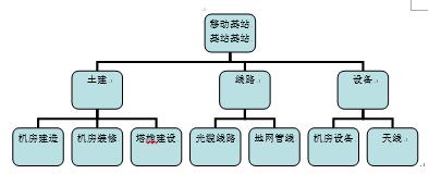 移动通信基站项目是集项目设计、采购、分包、土建、安装调试为一体的项目,项目建设环节涉及多个供应商和分包单位,从专业上分,主要可以分为土建、线路、设备三大专业类别,如下图所示: