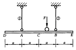 图示结构,载荷F可在刚性横梁DE上自由移动。杆1和杆2的横截面积均为A,许用应力均为[σ](拉、压相同)。则载荷F的许可值有四种答案:()
