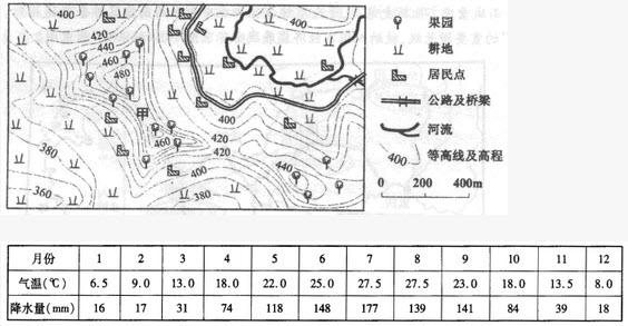 (简答题)该地计划在图幅所示东北部修建水库,水库最大蓄水量时,水面高程不超过390米。你是否赞成在该地修建水库?请依据图表信息说明理由。