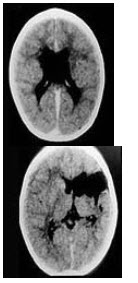 患儿,男,1岁,运动发育落后半年。生后5分钟Apgar评分5分。家族史阴性。查体:智力正常,双上肢活动正常,双下肢肌张力增高,腱反射亢进,踝阵挛阳性。CT检查如图。