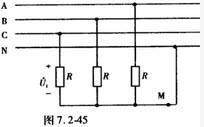 有一星形连接的对称负载接于线电压为380V的三相四线制电源上,如图7.2-45所示。当在M点断开时,U1为()。