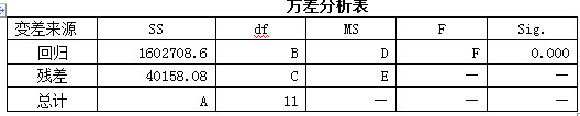 要求: (1)计算上面方差分析表中A、B、C、D、E、F处的值。 (2)商品销售量的变差中有多少是由广告费用的差异引起的? (3)销售量与广告费用之间的相关系数是多少?