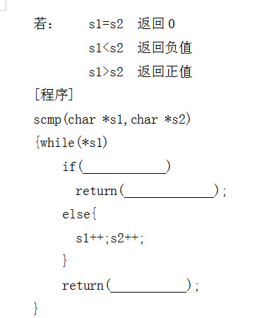 下面的函数用于比较两个给出的C字符串。按比较结果,函数将返回下列函数值:请补充程序()()()