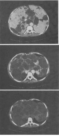 C:肝内可见多个大小不等的囊性病灶