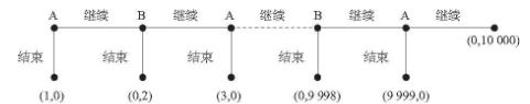 用逆向归纳法确定下面的“蜈蚣博弈”的结果。在该博弈中,第1步是A决策:如果A决定结束博弈,则A得到支付1,B得到支付0,如果A决定继续博弈,则博弈进入到第2步,由B做决策。此时,如果B决定结束博弈,则A得到支付0,B得到支付2,如果B决定继续博弈,则博弈进入到第3步,又由A做决策,如此等等,直到最后,博弈进入到第9999步,由A做决策。此时,如果A决定结束博弈,则A得到支付9999,B得到支付0;如果A决定继续博弈,则A得到支付0,B得到支付10000。