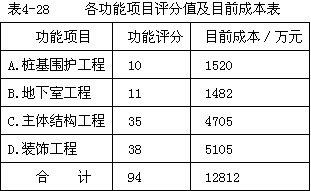 (简答题)为控制工程造价和进一步降低费用,拟针对所选的最优设计方案的土建工程部分,以工程材料费为对象开展价值工程分析。将土建工程划分为4个功能项目,各功能项目评分值及其目前成本见表4-28。按限额设计要求,目标成本额应控制为12170万元。