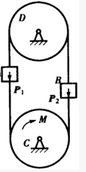 如图所示,升降机皮带轮C上作用一常力矩M,被提升重物A的重量为P1,平衡锤B的重量为P2,皮带轮C、D的半径均为R,重量均为Q,均为均质圆柱体。不计皮带质量,则重物A的加速度为()。