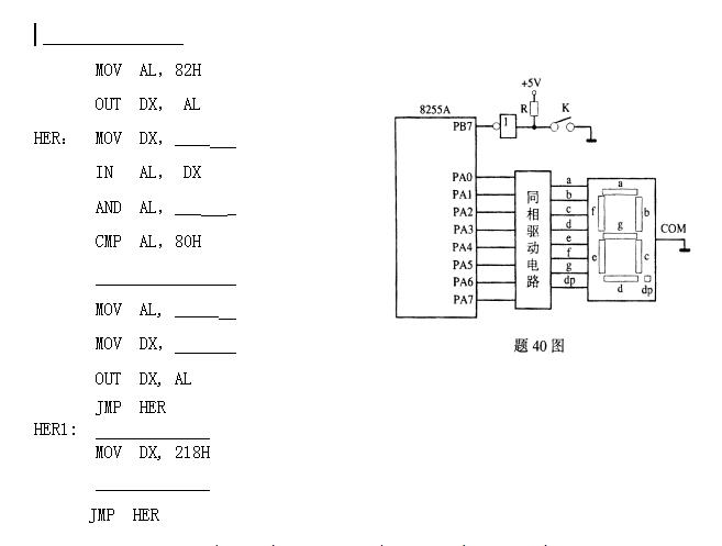 如图所示,8255A的PA口接一个LED共阴极数码管。要求当开关K闭合时,显示‘1’; 断开时,显示‘0’。已知:(1)‘0’字形码为3FH,‘1’字形码为06H;(2)8255A的端口地址分配如下:PA口地址:218H;PB口地址:219H;PC口地址:21AH;控制端口地址:21BH 试填写下列程序段,完成以上功能。