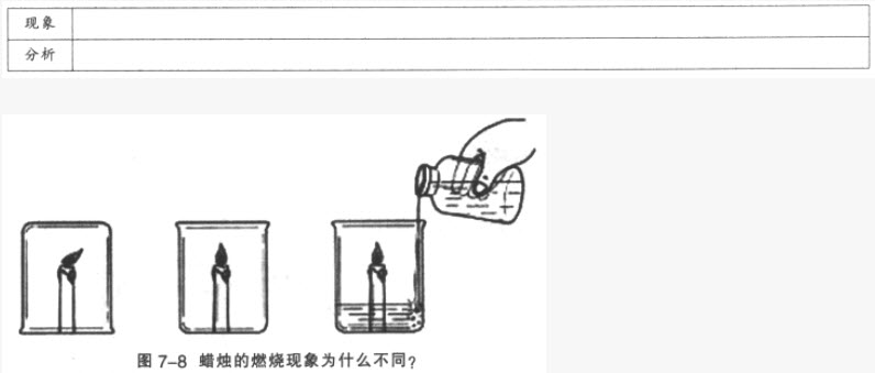 【实验7-2】点燃三支蜡烛,在其中一支蜡烛上扣一只烧杯;将另两支蜡烛放在烧杯,然后向其中一只烧杯中加适量碳酸钠和盐酸(如图7-8),观察现象并分析原因。
