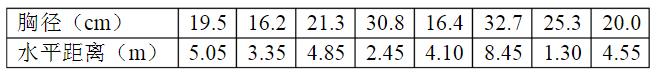 用断面积系数为4的角规对某待测林分(坡度忽略不计)进行控制检尺,绕侧一周后,测得观测特征值不为零的各树木胸径以及树干中心至角规点的水平距离如下表,试求该林分的断面积和蓄积量?为方便起见,设各树树干材积均按V=0.0004D
