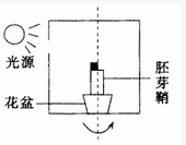 如图所示,在一去掉尖端的胚芽鞘一侧放置含适宜浓度生长素的琼脂块,再将花盆放入暗箱中,以一定速度匀速旋转一段时间后,在图示的位置停止。胚芽鞘的生长情况是()。