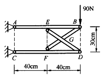 两水平杆AB和CD用两根交叉链杆BF和DE相连,荷载和支撑情况如图所示,如果不计各杆自重,则链杆DE的内力为()。