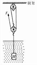 如图是利用滑轮组匀速提升水中圆柱体M的示意图,滑轮组同定在钢架上,滑轮组中的丽个滑轮质量相等,绕在滑轮组上的绳子能承受的最大拉力为900N,连接圆柱体M与动滑轮挂钩的绳子能承受的最大拉力为3000N。圆柱体M高为3m,底面积为0.02m