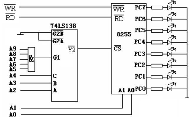 如图所示,将8255的C端口接8个发光二极管,使这8个发光二极管依次亮灭,其中74LS138译码器与地址总线已经连接正确。