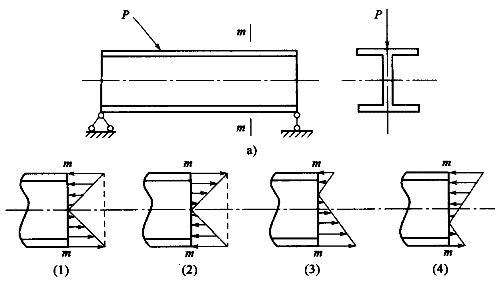 工字形截面梁在图示荷载作用上,截面m—m上的正应力分布为:()