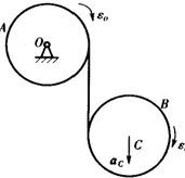 ]如图所示,均质圆柱A、B重均为P,半径均为r,绳子一端绕在绕O轴转动的A圆柱上,另一端绕在B圆柱上。若不计摩擦,则B落下时其质心C的加速度aC为()。