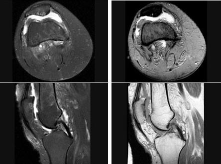 男性,11岁。左下肢外伤后疼痛10天,加重伴活动受限、发热3天入院。缘于10天前跑步时撞伤左大腿,明显疼痛,活动受限,卧床休息后稍缓解。3天前疼痛加重,伴发热,体温高达40℃,曾在当地医院静滴青霉素治疗。X线片检查未发现异常。查体:T38.8℃,P110次/分。左大腿周径35cm,右大腿周径32cm,双小腿周径25cm。足背动脉搏动良好,皮肤感觉正常。目前,临床初步诊断为股骨下段化脓性骨髓炎,早期确诊的主要依据是(提示:检查结果:WBC22.44×10/L,N87%,RBC3.75×10/L,Hb90.6/L,PLT386×10/L,C-反应蛋白182mg/L,血沉110mm/h,血钾3.4mmol/L,血钠130.2mmol/L。)()