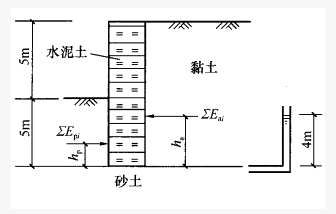 10m的黏土层下为含承压水的砂土层,承压水头高4m,拟开挖5m深的建筑基坑,γ0=1.0,采用重力式水泥土墙支护,水泥土重度为20kN/m3,墙总高为10m,水泥土墙密度B=3.6m。如图所示,每延米墙后的总主动土压力标准值为600kN/m,作用点距墙底4.0m;墙前总被动土压力标准值为1200kN/m,作用点距墙底2.0m。试问:该水泥土墙的抗倾覆安全系数最接近下列()项。()