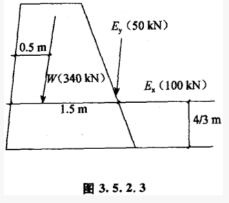 某重力式挡土墙,其重力W=340kN,如图3.5.2.3所示,则其抗倾覆稳定性系数为()。