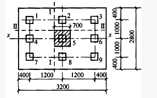某建筑柱下桩基,为9桩承台,柱及承台相关尺寸如图所示,柱位于承台中心,柱截面尺寸为700mm×600mm,相应于作用的基本组合的柱轴压力值F=3600kN,承台高为1.2m,承台采用C25混凝土(fT=1.27N/mm2),取h0=1.1m。桩截面尺寸为400mm×400mm。按《建筑地基基础设计规范》作答。
