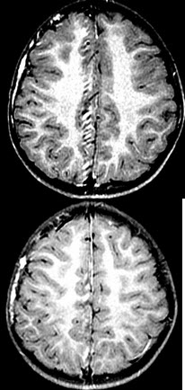 4岁小男孩,右侧颜面部有紫红色瘤,智力障碍,MR检查如图,请选择最可能的诊断( )