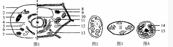 (1)图中的结构1~15中不应该出现的是()和(),可能含有水溶性色素的是(),结构15与()的形成有关。 (2)图2、图3、图4所示在结构上的主要共同点是________,图2、图3所示结构的名称分别是________,在其中进行的循环Ⅰ和Ⅱ的名称分别是________、________。 (3)已知进行有性生殖的某生物同时具有图2、图3、图4所示三种结构,这三种结构中的DNA能从父本传递给子代的是________。