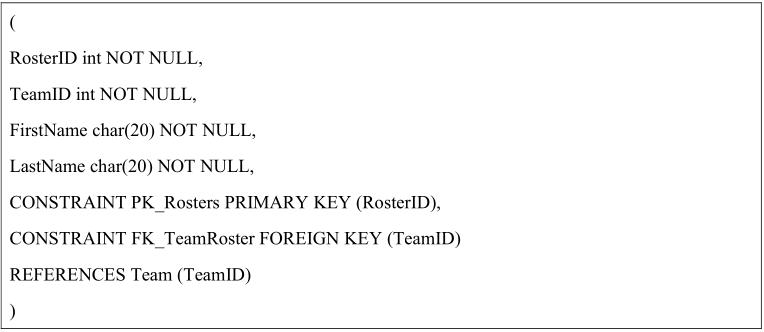 你是一个公司的数据库开发者,该公司为棒球队编辑统计数据.这些统计数字被储存在Statistics数据库中.每个队的队员被登记在Statistics数据库的表Rosters中.创建表Rosters的脚本如下所示: