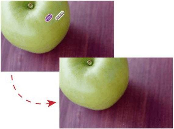 如图所示,使用修复画笔工具将左上图苹果上的商标修复成右下图所示,请问,在使用修复画笔工具定义修复源时,下列说法正确的是()。