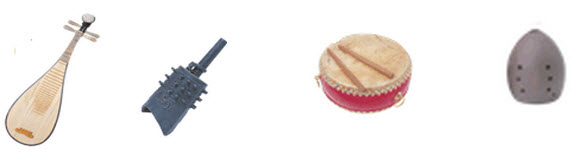 看中国乐器图四幅,根据中国古代八音分类法,从左向右按乐器材质正确的排列顺序是()